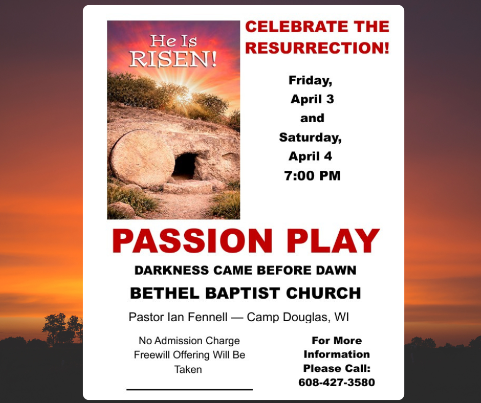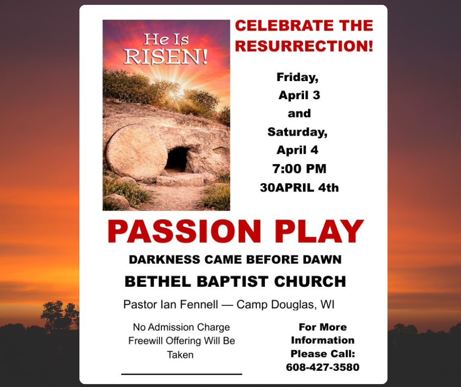 Passion Play- April 3rd & 4th Click Here For More Service Times Sunday school 9:00am • Morning service 10:00am • Sunday evening 6:30pm • Wednesday Prayer Meeting 6:30pm • Sunday school 9:00am • Morning service 10:00am • Sunday evening 6:30pm • Wednesday Prayer Meeting 6:30pm • Sunday school 9:00am • Morning service 10:00am • Sunday evening 6:30pm • Wednesday Prayer Meeting 6:30pm •